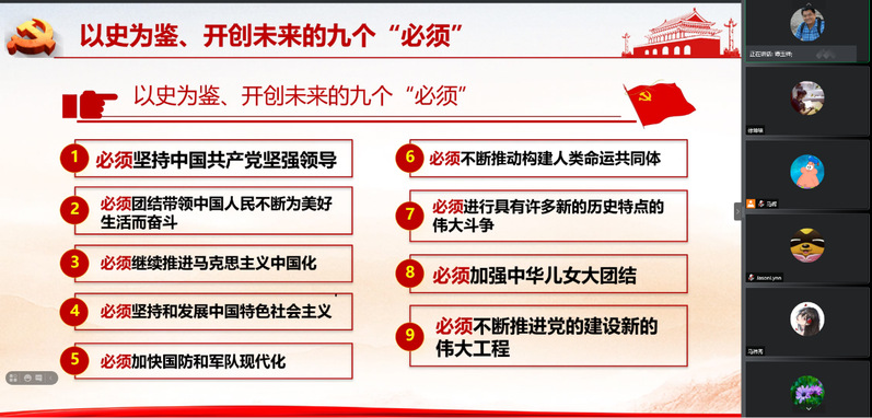 最后,谭书记基于百年党史历程,对全体党员同志做出了寄语,强调所有党员同志作为新时代青年,一定要以实现中华民族伟大复兴为己任,牢记初心使命,坚定理想信念,践行党的宗旨,增强做中国人的志气、骨气、底气,不负时代,不负韶华,不负党和人民的殷切期望!