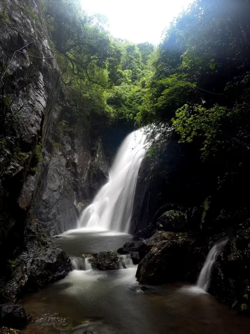 下午,老师们来到三桠塘幽谷探险。三桠塘幽谷地处五指山景区,环境幽静、空气清新,又是一个天然的大氧吧。老师们小心地踏着崎岖的石板路朔溪而上。一路可见幽谷茂密的翠竹和亚热带雨林,不时还能看到形态各异的古藤和奇石,十几个大小瀑布让老师不时驻足欣赏、拍照留影。经过约一个小时的努力,最终老师们到达山顶的三桠塘水库。水库不大,却又是一块青色翡翠。