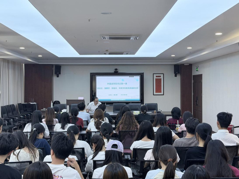 9月23日下午,外国语学院党委书记龚义荣以“明定位、强素质、担使命,共筑学院教育质量新台阶”为主题,为学院学生党员干部、团委学生会干部及2023至2024级班、团干部讲授秋季学期“思政第一课”。
