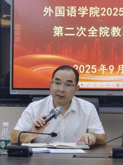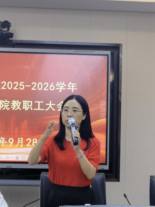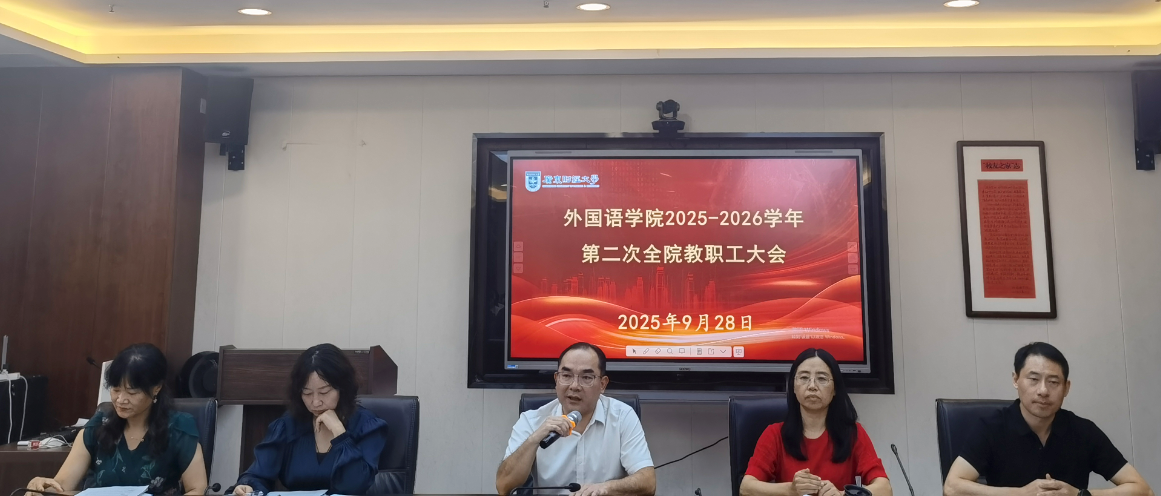 2025年9月28日下午,外国语学院召开全体教职工大会,聚焦师德师风建设、国庆期间安全教育与本科教育教学审核评估等核心工作,进行专题学习、阶段总结和部署动员。学院党政领导及全体教职工参加会议。