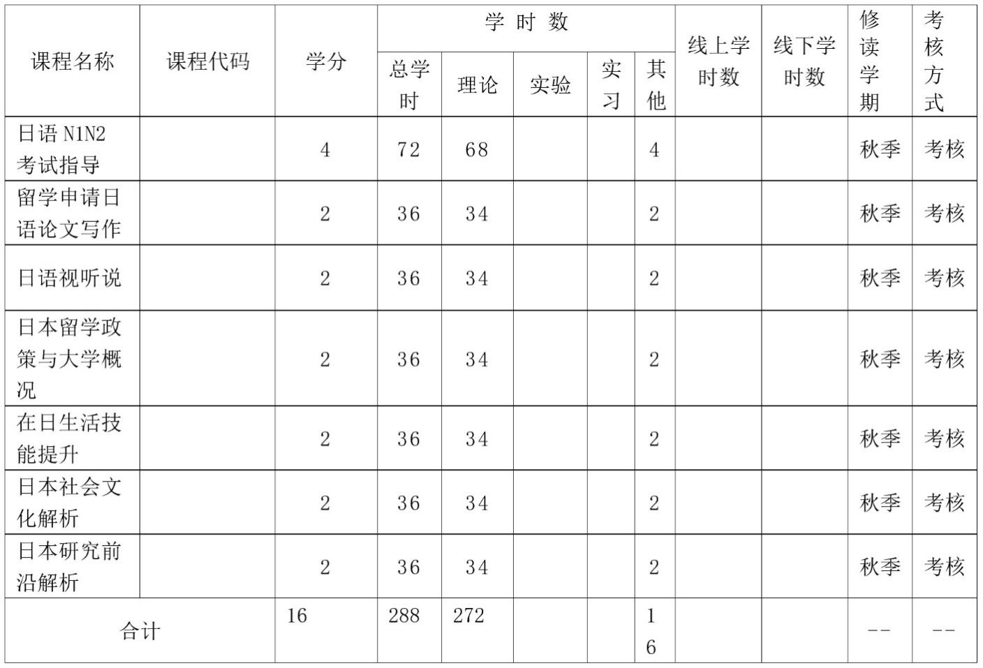 共开设7门课程,分两大类课程。(1)专业知识类课程:讲授日语能力测试N1、留学申请论文写作、日本大学概况、留学日语口语等知识;(2)实践技能类课程:让学生掌握留学日本所必需的日语语言能力、生活技能、应试技巧和面试技巧。具体学分、学时数等详见下表1。