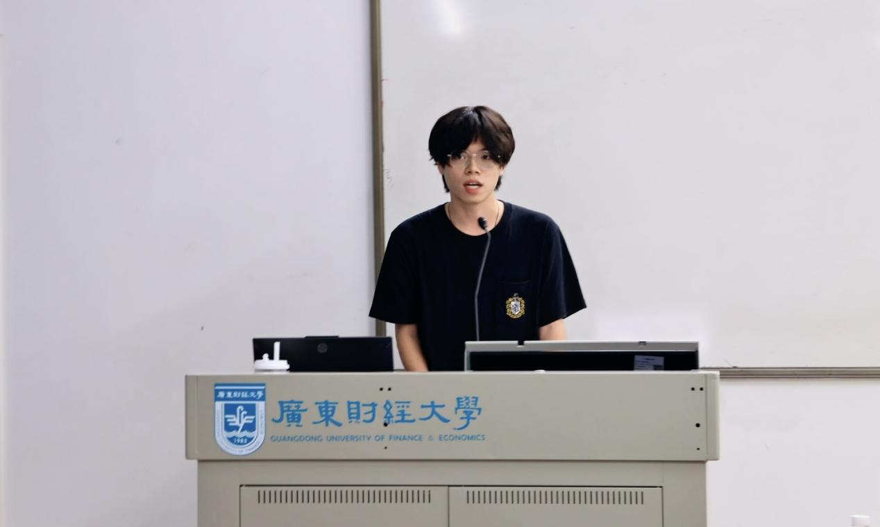 随后,赤梦光影实践团负责人王郁龙同学带来“双语述峥嵘”的红色故事。他分享了团队在河源连平大湖镇的调研历程——如何在火敬副教授指导下深挖革命史料,如何反复打磨《中共连平县第一党支部革命斗争史》中英双语手册、精心录制专题讲解视频;还特别提到在红色课堂上,看到孩子们眼中燃起对家乡历史的好奇时,更加坚定了“让红色基因代代传”的信念,引发共鸣。