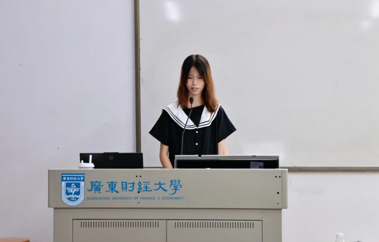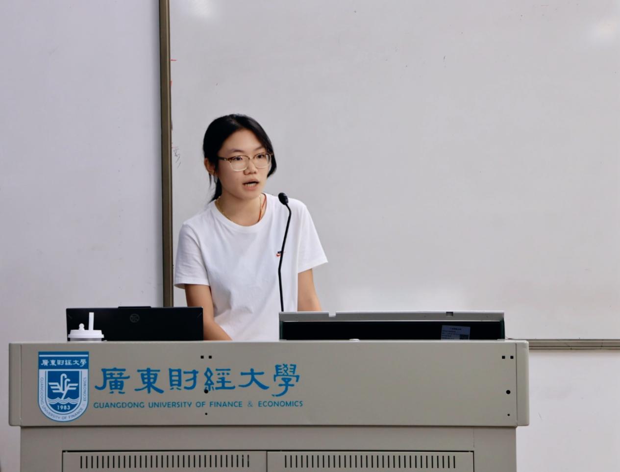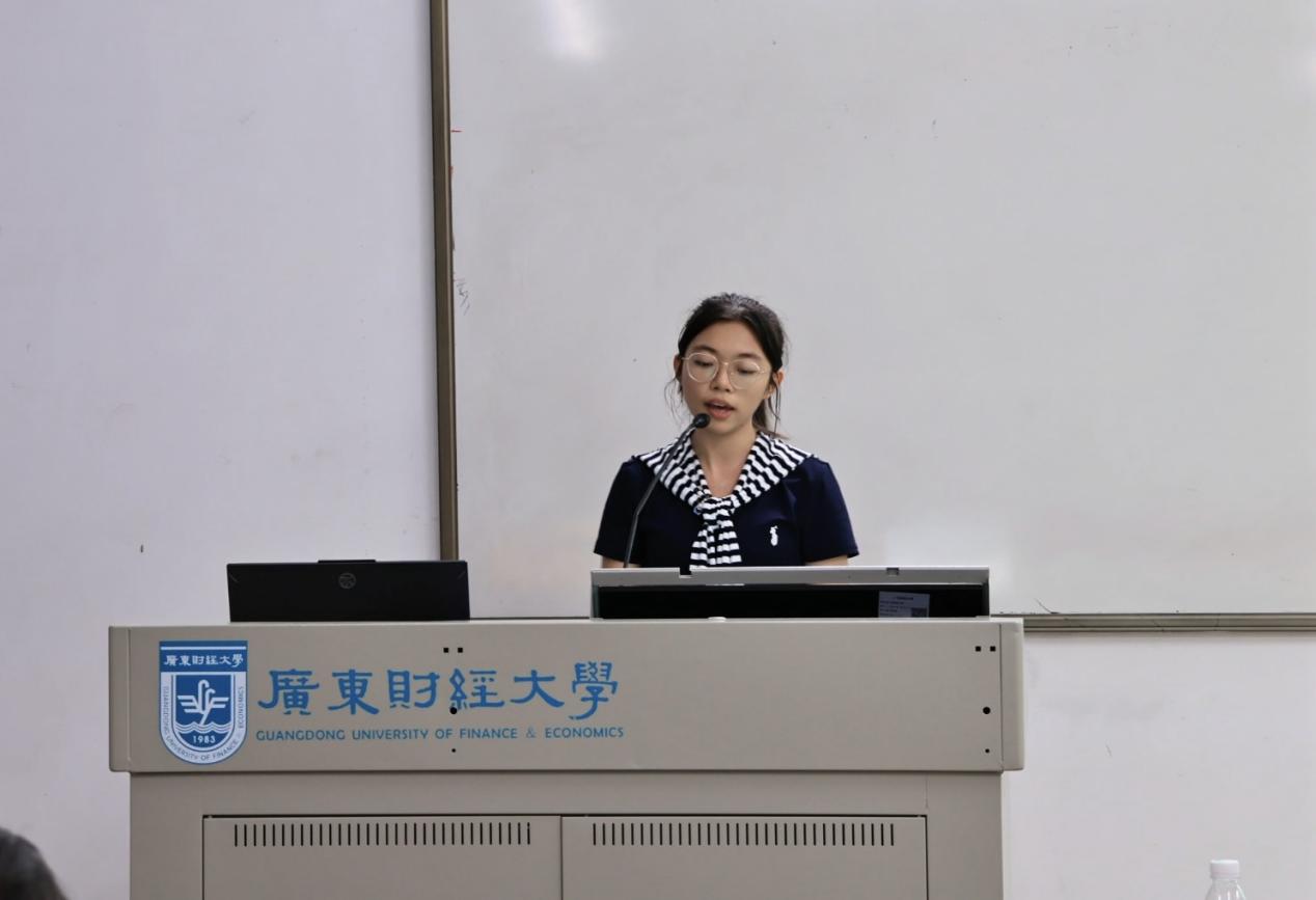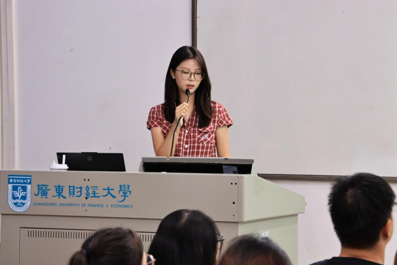 筑梦粤兴实践团负责人钟晓莹同学以“涉外搭心桥,文化共相融”为主线展开分享。她详细讲述团队走进东莞东城街道的经历:从线上收集问卷、线下走访外籍家庭,到用中英双语调研破解外籍人士生活难题;更提及策划传统文化体验活动时的巧思,以及看到中外居民踊跃参与、文化认同悄然萌芽时的感动,让现场同学们真切感受到跨文化交流的温度。
