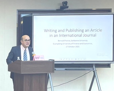 10月27日,法国巴黎索邦大学总体文学与比较文学教授、欧洲科学与艺术院院士、欧洲比较文学学会主席Bernard Franco应邀到我院开展学术交流,并以“Writing and Publishing an Article in an International Journal”为题,为我院师生带来内容充实、逻辑严谨的学术报告。学院院长杜萍教授主持活动,学院教师和研究生参会交流。