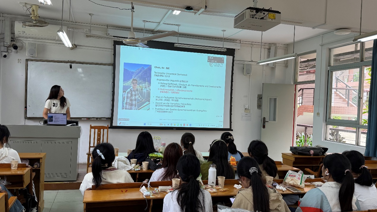 为帮助首届德语专业新生坚定专业信念、明晰学习路径与未来发展规划,2025年10月21日,德语系成功举办“德语学习分享会”。活动特邀目前就读于德国达姆施塔特工业大学、硕士攻读德语应用语言学专业的陈同学担任主讲,为我系2025级全体新生带来了一场内容充实、富有启发的学习交流盛宴。