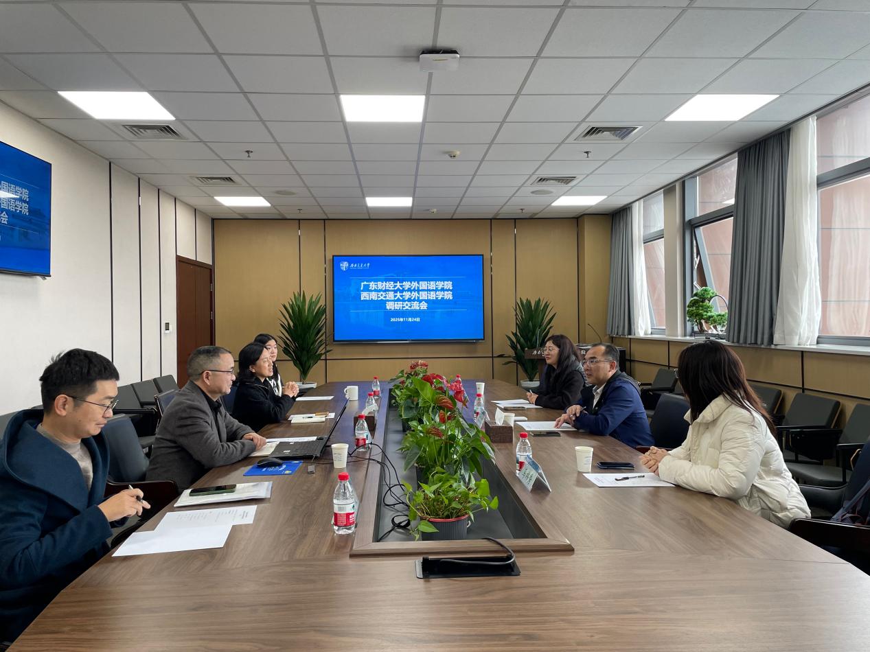 在西南财经大学的调研中,双方就各自在大学英语教学、专业课程设置方面的做法与经验进行了充分交流,并重点围绕 “人才出口”导向的培养模式、外语专业如何与学校财经特色深度融合以及招生就业工作面临的挑战与对策等核心议题展开了热烈讨论。龚义荣书记介绍了广财外国语学院的发展历程与现状,并表示西南财经大学外国语学院在依托学校财经学科优势、打造特色方向方面的成功经验值得深入学习。