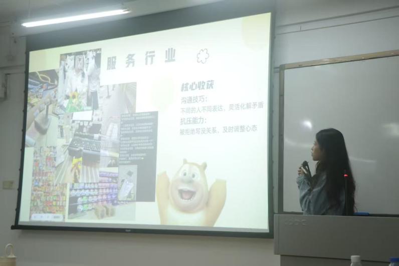 在轻松愉快的互动环节后,活动进入核心的经验分享阶段。来自广州校区的黎文静、陈可琪、陈慧然、张玮玟、谢子亮等同学,以及佛山校区的王宇晴、林芯苡、江莹莹、李沁、梁丽红等同学,依次登台分享各自的职场初体验。