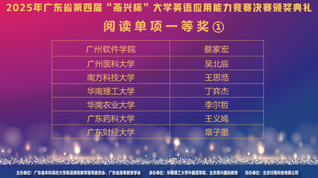 12月7号,2025年广东省第四届“燕兴杯”大学英语应用能力竞赛广东省决赛在华南理工大学落下帷幕。我校优秀学子们凭借优异的表现荣获两个综合能力一等奖和阅读能力单项一等奖!