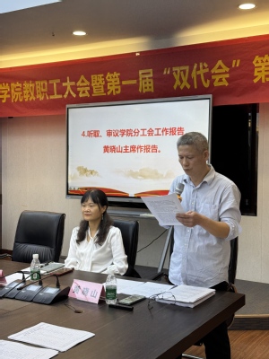 黄晓山代表学院分工会作2025年度分工会工作报告。他说,2025年,学院分工会深入贯彻习近平总书记关于工会工作的重要论述精神,在校工会和学院党政的关心指导,以及全体教职工的支持帮助和共同努力下,完成了大量工作任务。他围绕提升理论素养、参加学校文体活动、参加学校体育比赛、举办学院文体活动、举办教师疗休养活动、关心教师福利、做好女工工作、关心教师身心健康、关注教学工作、组织参加学校“双代会”等十四个方面回顾了2025年分工会所做工作及取得的成绩,并对2026年分工会工作提出计划。